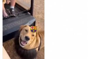 视频中,一只狮子被加上了巴萨队徽,跑到带着马竞队徽的人身前,被薅下头套,下面是条狗。