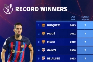 体育资讯4月19日讯 德国转会市场统计了球员国王杯夺冠次数,并列出榜单,布斯克茨、皮克、梅西等5名球员7冠居首,前10名中,有8名球员在巴萨夺得过国王杯冠军。