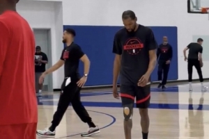 G2能否复出?杜兰特参加火箭训练加练投篮 右膝贴满护具