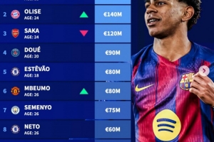 体育资讯4月13日讯 德转更新了足坛右边锋身价情况,亚马尔以2亿欧居首,奥利塞以1.4亿欧位居次席。